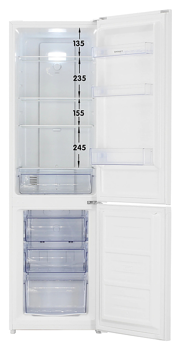 Холодильник Kraft KF-NF291W предназначен для охлаждения, заморозки, кратковременного и длительного хранения пищевых продуктов и напитков в домашних условиях. Модель оснащена холодильной камерой сверху и морозильной камерой снизу с правосторонними перенавешиваемыми распашными дверьми, кабелем питания с евровилкой и расположенной внутри холодильной камеры электромеханической панелью управления. Фасады дверей и боковины выполнены из металла с антикоррозийным покрытием белого цвета, внутренняя облицовка камер – из белого пластика, плоские полки – из прозрачного безопасного закаленного стекла с окантовкой из белого пластика, ящики и навесные полки – из прозрачного полимера, упаковка – из гофрокартона, полимерной пленки и полистирола.