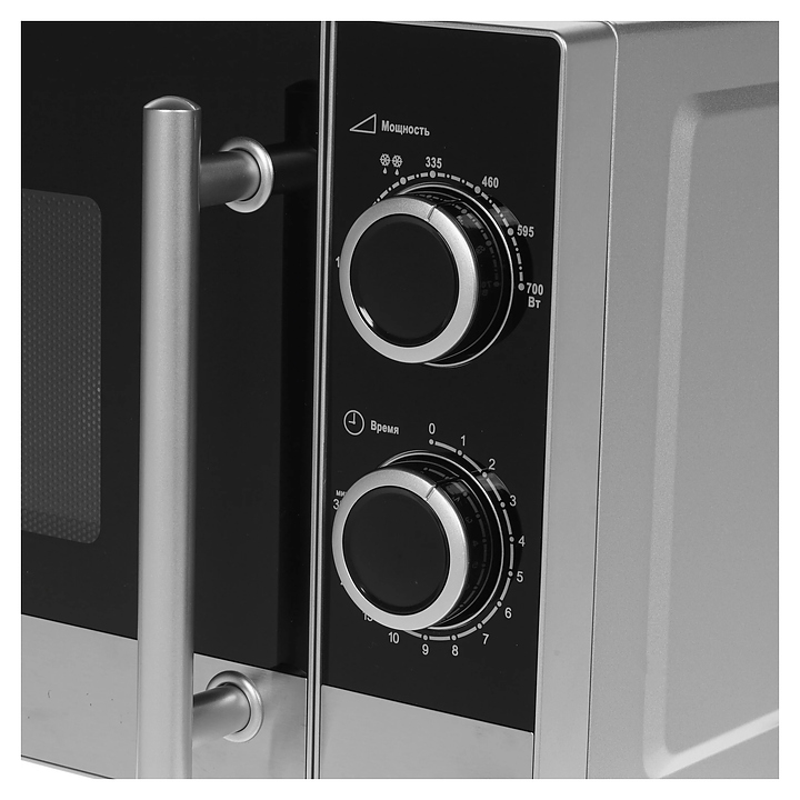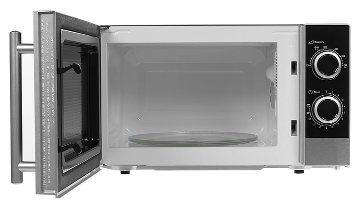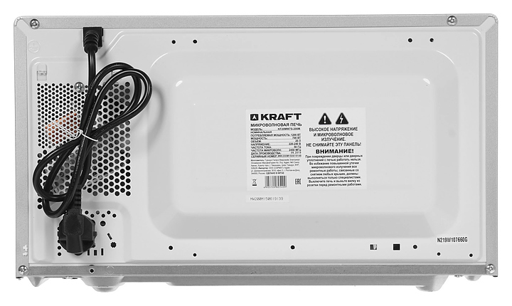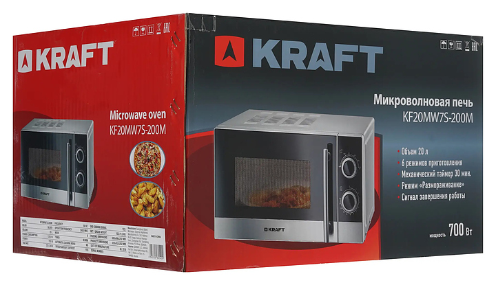 Микроволновая печь Kraft KF 20 MW7S-200 M предназначена для приготовления пищи, подогрева готовых блюд и ингредиентов, а также размораживания полуфабрикатов в гостиницах, офисах и домашних условиях. Модель оснащена кабелем питания с евровилкой, камерой с распашной дверью с вертикальной рукояткой, смотровым окном и расположенной в правой части фронта электромеханической панелью управления с 2 поворотными переключателями. Корпус и нижняя часть фасада выполнены из стали с поверхностью серебристого оттенка, верхняя часть фасада черного цвета, дверь с частичным фронтальным остеклением без винтового крепежа прозрачным стеклом, внутренняя облицовка камеры с покрытием эмалью легкой очистки, тарелка – из ударопрочного стекла, рукоятка круглого сечения с серебристой поверхностью, переключатели цилиндрической формы с поверхностью черного цвета и серебристыми фронтальными окантовками. Комплектация: