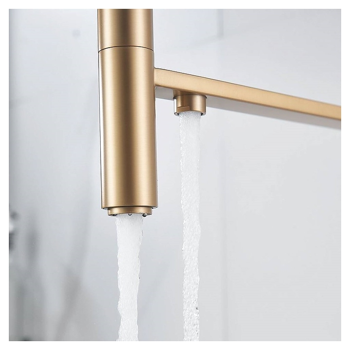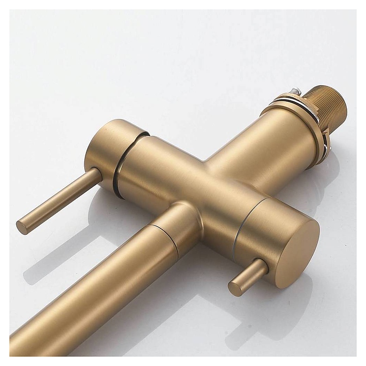 Смеситель для раковины Maretti Calabria GOLD CAG31RGF18 предназначен для подачи горячей и холодной воды в кухонных помещениях. Модель оснащена гибким изливом для водопроводной воды, дополнительным изливом для питьевой воды и керамическим картриджем, обеспечивающим плавный ход рычага смесителя, контроль и точность при выборе напора и температуры воды. Аэратор экономит расход воды, уменьшает шум, снижает количество брызг и отличается легкой очисткой. Корпус выполнен из латуни, отличающейся прочностью, долговечностью и устойчивостью к перепадам температур, внешняя сторона излива - из силикона. В комплект поставки входят смеситель, гибкая подводка и крепления. Особенности:
