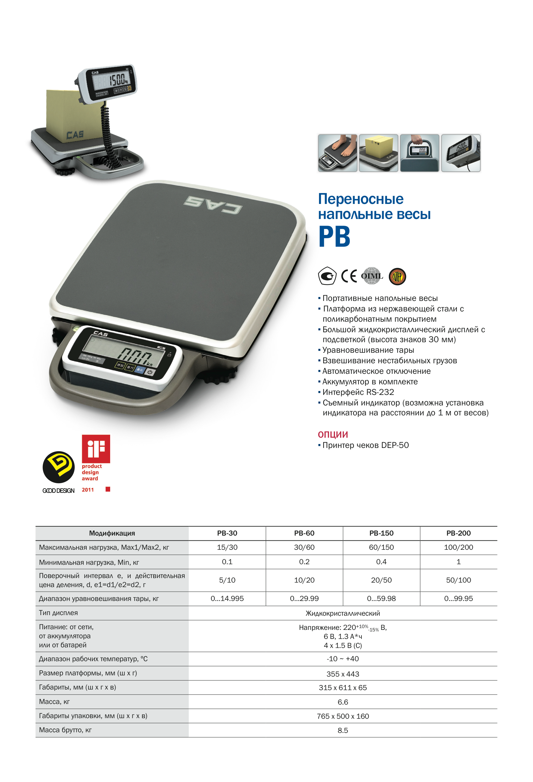 Напольные весы CAS PB-60 используются на предприятиях общественного питания и торговли. Модель оснащена жидкокристаллическим дисплеем с подсветкой на витом шнуре, тензометрическим типом измерения, усреднением показаний массы при нестабильной нагрузке и индикацией разрядки батареи. В комплект поставки входит адаптер питания. Особенности: