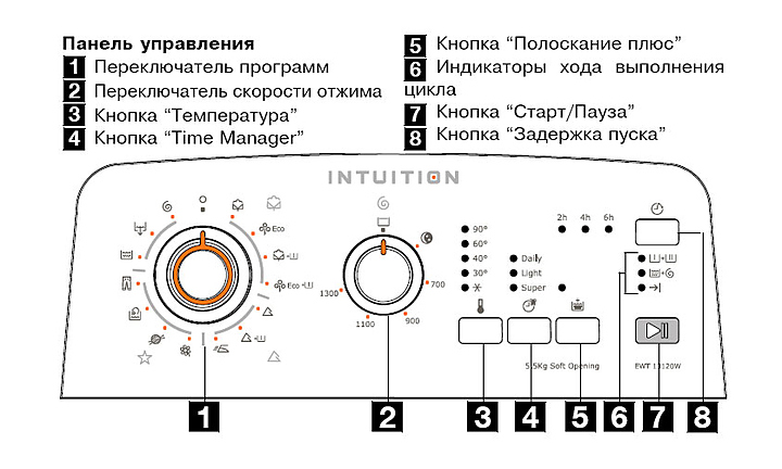 INTUITION EWT10120W. Модель с простым интуитивным управлением. Макс. скорость вращения барабана при отжиме составляет 1000 об/мин.