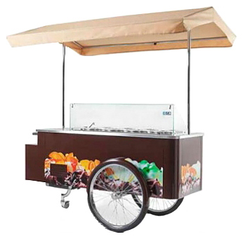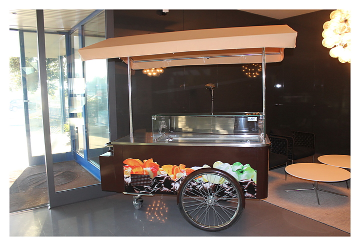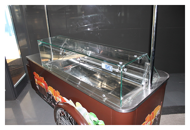 Тележка ISA Carrettino используется на предприятиях общественного питания и торговли и на улице для демонстрации, хранения и продажи мороженого, сорбета и йогурта-мороженого. Каркас изготовлен из углеродистой стали, окрашенной порошковой краской, внутренняя оболочка - из нержавеющей стали, внешняя и боковая панели - из стали с нанесенным методом шелкографии рисунком, сдвижные крышки со стороны продавца - из метакрилата. Цельный корпус имеет изоляцию из пенополиуретана, вспененного углекислотой, без использования озоноразрушающих веществ. В комплект поставки входят система мойки ложечек, раковина с краном, насос подачи воды и сливной шланг. Особенности: