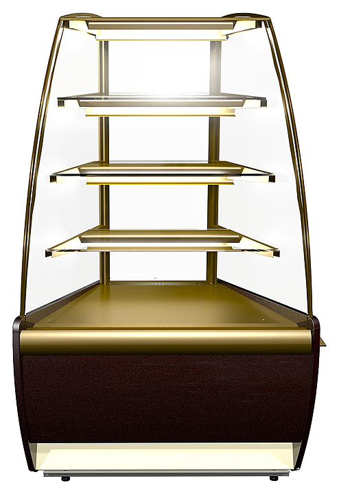 Угловая кондитерская витрина Carboma K70 VM-3 Light (ВХСв - У1д) используется на предприятиях общественного питания и торговли для демонстрации, охлаждения и кратковременного хранения тортов, пирожных и других кондитерских изделий. Модель оснащена изогнутым фронтальным стеклом и прямыми боковыми стеклами. Корпус выполнен из стали, боковины - из пластика, распашные задние створки - из оргстекла, термоизоляция корпуса и боковин - из пенополиуретана. Особенности:
