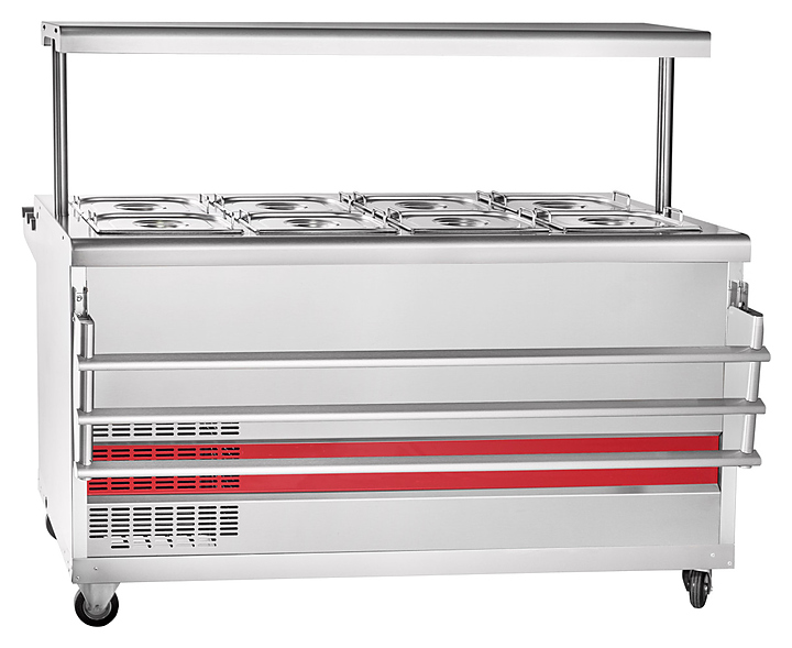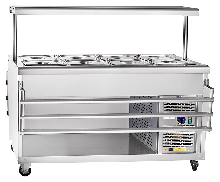 Прилавок-витрина Abat ПВВ(Н)-70ПМ-01-НШ используется в составе передвижной линии раздач для демонстрации, охлаждения, кратковременного хранения блюд, холодных закусок и напитков на предприятиях общественного питания и торговли. Модель оснащена колесами со стопорным механизмом. Конструкция выполнена из нержавеющей стали. Особенности: