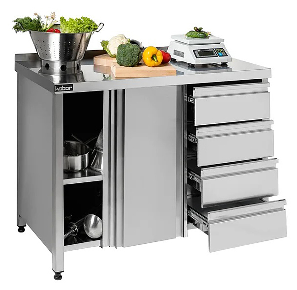 Стол-тумба Кобор СТ/1-150/60 произведена из высококачественной нержавеющей стали, что позволяет использовать предмет в различных цехах. Во избежание прогибов столешница усилена листом ОСП толщиной 16 мм. Ножки изделия регулируются по высоте, для исключения проблем с неровным напольным покрытием, предотвращая наклон рабочей поверности. Особенности: