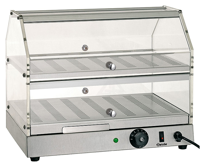 Тепловая витрина Bartscher A203094 предназначена для демонстрации и поддержания в теплом состоянии хлебобулочных изделий, вторых блюд и гарниров на предприятиях общественного питания и в крупных супермаркетах. Корпус выполнен из хромоникелевой стали, колпак - из оргстекла (плексигласа). Особенности: