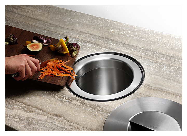Система хранения мусора Blanco Solon позволяет отправлять мусор в ведро непосредственно со столешницы, минуя препятствия. Это помогает организовать удобную работу, а также высвободить дополнительное место под мойкой. Кроме того уникальный дизайн системы послужит стильным дополнением рабочей зоны. Особенности:
