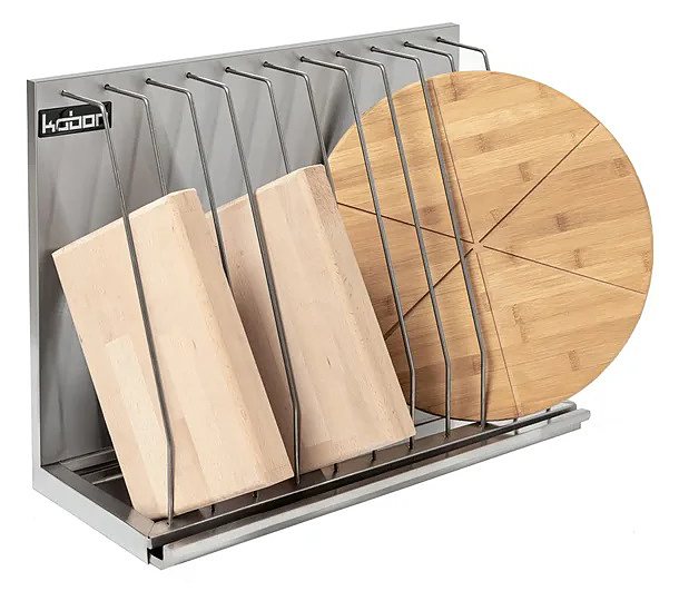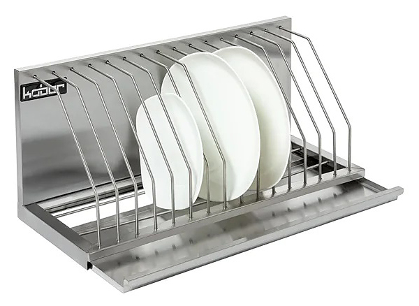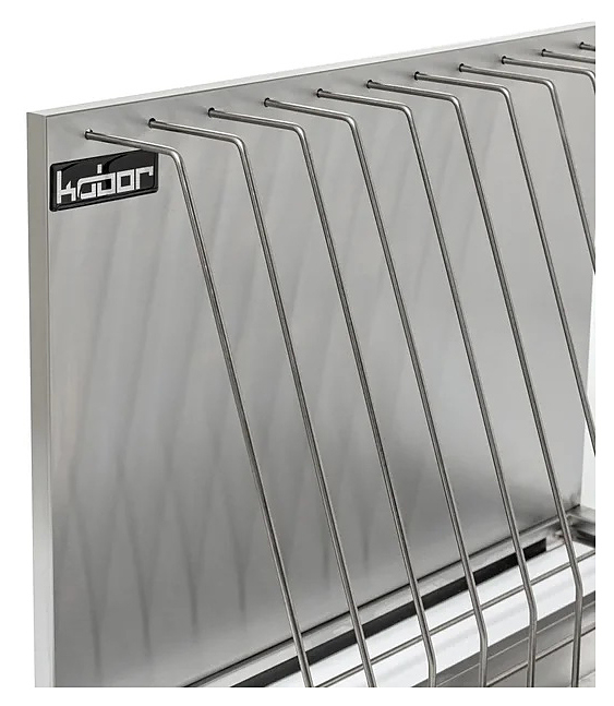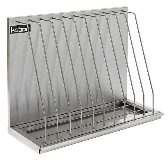 Настенная полка Кобор ПКД-30/25 состоит из широких ячеек, что помогает разместить 4 доски разной толщины. Внизу полки находится специальный поддон для сбора воды.