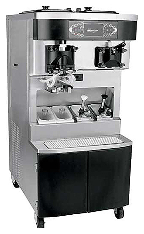 Фризер Taylor C606 предназначен для приготовления одного вкуса мягкого мороженого и 4 видов молочного коктейля: ванильного, шоколадного, клубничного и дополнительного на выбор. Оборудование оснащено системой пастеризации, воздушным охлаждением и электронным управлением. Микропроцессор контролирует вязкость смеси, изменяя температуру заморозки. Воздушно-молочная помпа служит для насыщения воздухом приготовленного продукта и подачи его в морозильный цилиндр. LED-дисплей показывает температуру в камере хранения и морозильном цилиндре, дни до очистки, историю выбора температуры и времени системы пастеризации последних 366 циклов. Индикатор Mix Out автоматически выключает аппарат при отсутствии смеси. Световой индикатор Mix Out предупреждает о низком уровне продукта. Во фризер встроены эргономичная ручка, 2 емкости с подогревом и 2 без. Сиропная система подает точное количество сиропа в коктейли из контейнеров, расположенных внизу. Дополнительные характеристики: