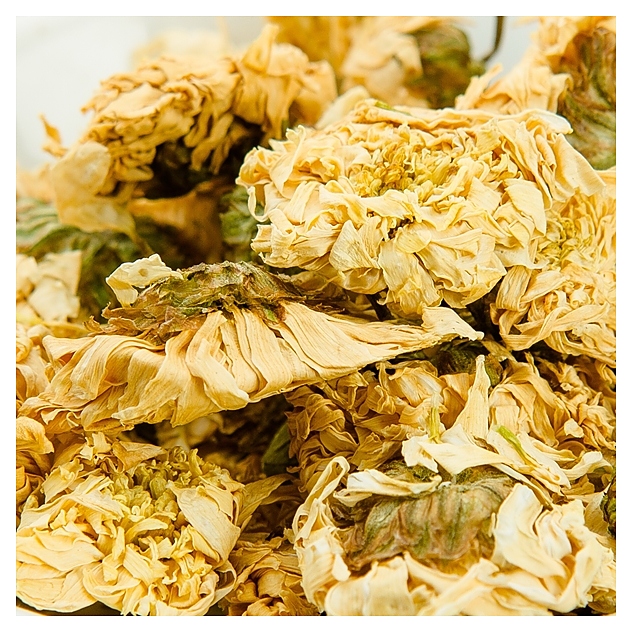 Хризантемы Цзюй Хуа выращивают в провинции Аньхой (район Хуаньшань (Желтые горы), Китай). Цветки используются как добавка к различным сортам чая, придавая им цветочный аромат, а также могут завариваться как самостоятельный напиток. Изумрудно-зеленый настой обладает пряным сладковато-свежим цветочным вкусом и ароматом. Полезные свойства Заваривание Цена указана за 100 гр. Внимание! Информация о товарах, размещенная на сайте, не является публичной офертой, определяемой положениями Части 2 Статьи 437 Гражданского кодекса Российской Федерации. Производители вправе вносить изменения в технические характеристики, внешний вид и комплектацию товаров без предварительного уведомления. Уточняйте характеристики у наших менеджеров перед оформлением заказа. |