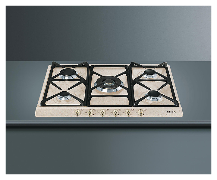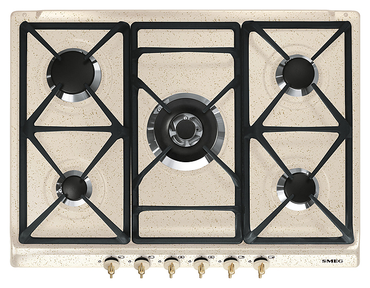 Управление газовой варочной панели Smeg SPR876AVOGH происходит с помощью поворотных переключателей. Оборудование относится к серии Coloniale. Варочная панель легко подвергается санитарной обработке. В комплект входят жиклеры для сжиженного газа G30. Дополнительные характеристики: