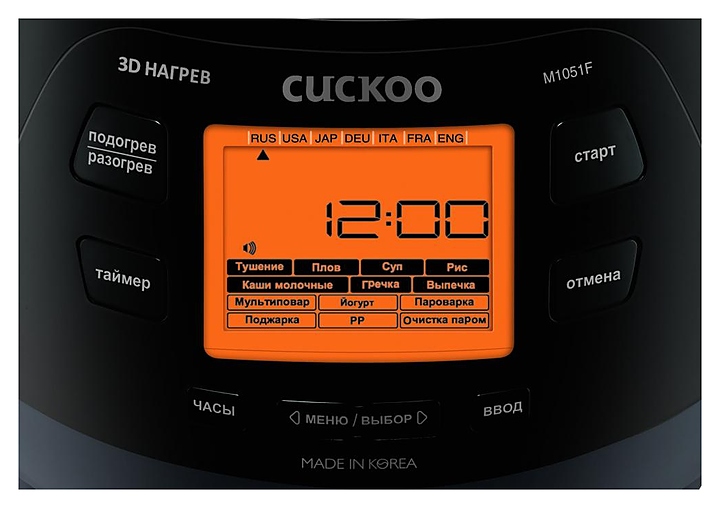 Мультиварка Cuckoo СМС-M1051F предназначена для тушения, варки, приготовления на пару, обжаривания, запекания и выпечки, а также оснащена специальным режимом для приготовления домашнего йогурта в частных домах, квартирах и т.д. Модель оснащена электронной панелью управления. В комплект поставки входят ложка, мерный стаканчик, паровая пластина, спица для очистки каналов выпуска пара, книга рецептов и инструкция. Особенности: