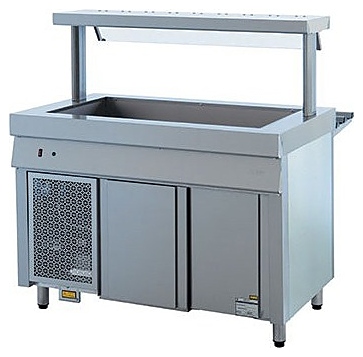 Стол ATESY Белла-Нота-2005 предназначен для непродолжительного хранения или демонстрации продуктов на предприятиях общественного питания, в отделах готовой продукции гипермаркетов. Модель оснащена стойкой, на которой можно хранить емкости или посуду, а также осуществлять раздачу. Ванну можно использовать в двух вариациях: погружать продукты в собственной таре на дно (консервы, тарелки с продуктами) или ставить в ванну гастроемкости с продукцией. В комплект поставки входят направляющая для подносов (1200х320 мм) и одноярусная полка, выполненные из нержавеющей стали. Особенности: