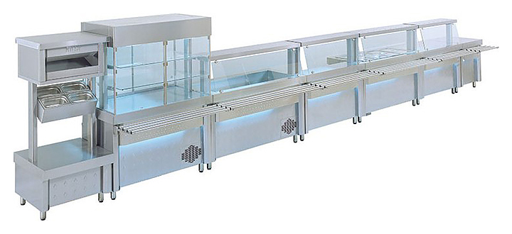 Мармит ATESY Белла-Нева-2004 используется для поддержания в горячем состоянии гарниров и вторых блюд. Модуль предназначен для использования в составе линии раздачи, а также отдельно на предприятиях общественного питания. Устройство может быть укомплектовано 6 гастроемкостями, под каждой из которых располагается электронагреватель, обеспечивающий нагревание продуктов и блюд. Процесс нагревания гастроемкостей осуществляется посредством естественной конвекции. В нижней части мармита расположен шкаф с 4 распашными дверцами и 1 внутренней полкой, в котором можно хранить посуду и кухонные принадлежности. В комплект поставки входят направляющая для подносов и одноярусная полка из нержавеющей стали. Гастроемкости в комплект поставки не входят. Особенности: