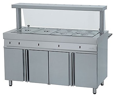 Мармит ATESY Белла-Нева-2004 используется для поддержания в горячем состоянии гарниров и вторых блюд. Модуль предназначен для использования в составе линии раздачи, а также отдельно на предприятиях общественного питания. Устройство может быть укомплектовано 6 гастроемкостями, под каждой из которых располагается электронагреватель, обеспечивающий нагревание продуктов и блюд. Процесс нагревания гастроемкостей осуществляется посредством естественной конвекции. В нижней части мармита расположен шкаф с 4 распашными дверцами и 1 внутренней полкой, в котором можно хранить посуду и кухонные принадлежности. В комплект поставки входят направляющая для подносов и одноярусная полка из нержавеющей стали. Гастроемкости в комплект поставки не входят. Особенности: