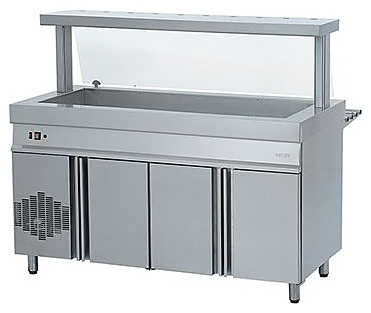 Холодильный стол ATESY Белла-Нева-2004 используется для хранения и демонстрации продуктов питания, напитков и готовых блюд на предприятиях общественного питания и в розничных торговых точках. Процесс охлаждения продуктов, помещенных в специальную нишу столешницы, осуществляется посредством холодильного агрегата фирмы Danfoss, расположенного в нижней части модуля. В зависимости от внешних условий (температуры окружающей среды, влажности и т.д.) режим работы агрегата может быть скорректирован при помощи поворота ручки регулятора температуры. Размеры вынны позволяют не только устанавливать в нее продукты в их собственной упаковке или посуде, но и использовать ее совместно со стандартными гастроемкостями. Гастроемкости в комплект поставки не входят. В комплект поставки входят направляющая для подносов и одноярусная полка, выполненные из нержавеющей стали. Особенности: