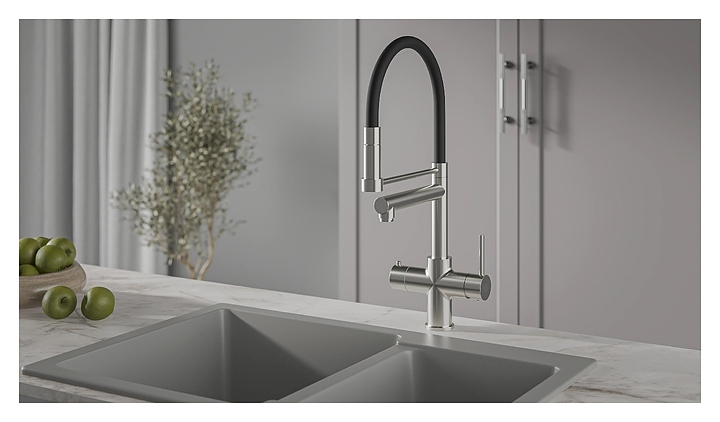 Система мгновенного кипячения воды ArtisanTech 4 в 1 Aquahot Rome - инновационный кухонный смеситель с бойлером используется для получения кипятка, горячей, холодной и фильтрованной воды в загородных домах и квартирах. Система нагрева и фильтрации, располагается под раковиной и включает в себя: изолированный резервуар, обеспечивающий мгновенный доступ к кипящей воде, прямое подключение к водопроводу для холодной, горячей и фильтрованной воды, интегрированные фильтры, очищающие воду от примесей и простую систему переключения между режимами. Модель оснашена интуитивно понятным управлением. Смеситель изготовлен из высококачественной латуни. Комплект поставки: