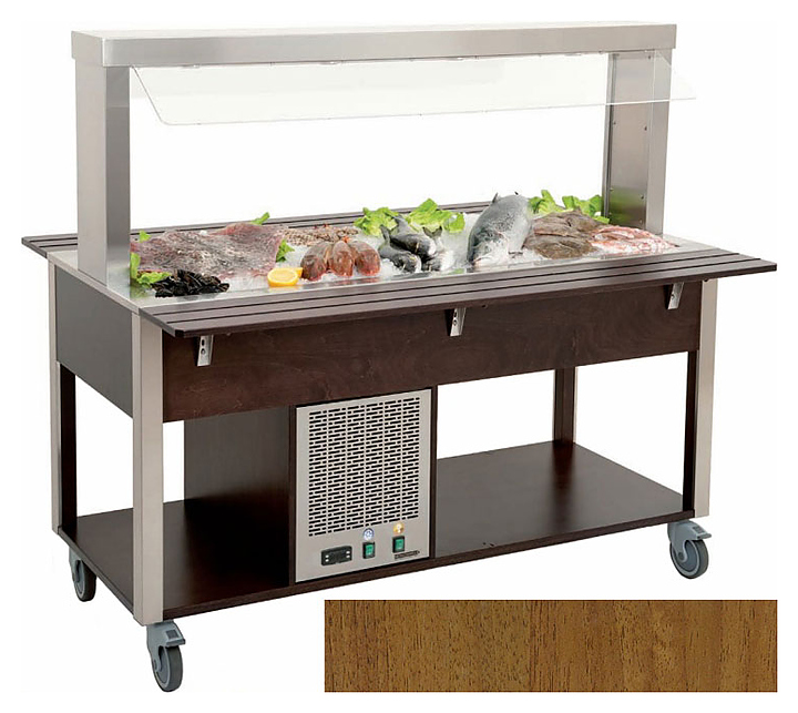 Шведский стол Metalcarrelli 6900.4-R предназначен для кратковременного хранения и демонстрации продуктов и готовых блюд на предприятиях общественного питания, а также в розничных торговых точках. Устройство оснащено удобной в использовании панелью управления с цифровым термостатом, термометром и выключателем с сигнальной лампой. Верхняя часть стола снабжена ванной, выполненной из нержавеющей стали AISI 304, предназначенной для установки в нее нескольких гастроемкостей стандартного типа. В верхней части конструкции располагается козырек из прозрачного акрила, размещенный на 2 стальных опорах. Гастроемкости в комплект поставки не входят. Особенности: