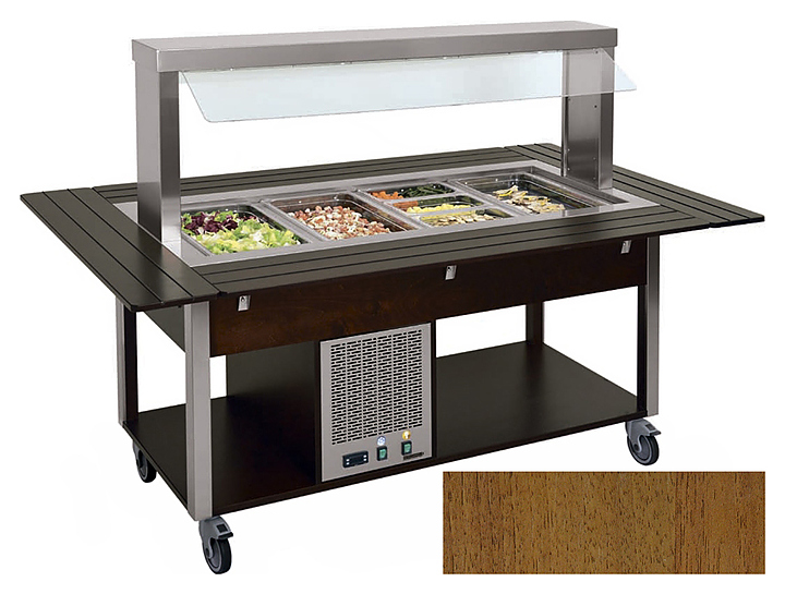 Шведский стол Metalcarrelli 6900.5-R предназначен для кратковременного хранения и демонстрации продуктов и готовых блюд на предприятиях общественного питания, а также в розничных торговых точках. Устройство оснащено удобной в использовании панелью управления с цифровым термостатом, термометром и выключателем с сигнальной лампой. Верхняя часть стола снабжена ванной, выполненной из нержавеющей стали AISI 304, предназначенной для установки в нее нескольких гастроемкостей стандартного типа. В верхней части конструкции располагается козырек из прозрачного акрила, размещенный на 2 стальных опорах. Гастроемкости в комплект поставки не входят. Особенности: