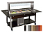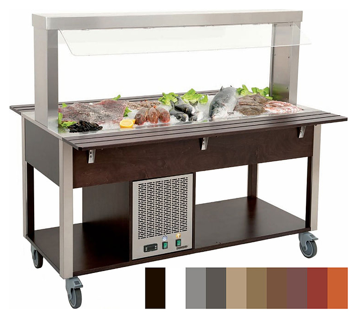 Шведский стол Metalcarrelli 6900.6-RAL предназначен для кратковременного хранения и демонстрации продуктов и готовых блюд на предприятиях общественного питания, а также в розничных торговых точках. Устройство оснащено удобной в использовании панелью управления с цифровым термостатом, термометром и выключателем с сигнальной лампой. Верхняя часть стола снабжена ванной, выполненной из нержавеющей стали AISI 304, предназначенной для установки в нее нескольких гастроемкостей стандартного типа. В верхней части конструкции располагается козырек из прозрачного акрила, размещенный на 2 стальных опорах. Гастроемкости в комплект поставки не входят. Особенности: