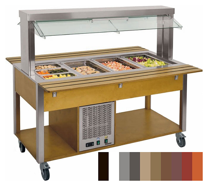 Шведский стол Metalcarrelli 6900.5M-RAL предназначен для кратковременного хранения и демонстрации продуктов и готовых блюд на предприятиях общественного питания, а также в розничных торговых точках. Устройство оснащено удобной в использовании панелью управления с цифровым термостатом, термометром и выключателем с сигнальной лампой. Верхняя часть стола снабжена ванной, выполненной из нержавеющей стали AISI 304, предназначенной для установки в нее нескольких гастроемкостей стандартного типа. Конструкция оснащена регулируемым по высоте козырьком из закаленного стекла, размещенным на 2 стальных опорах. Гастроемкости в комплект поставки не входят. Особенности: