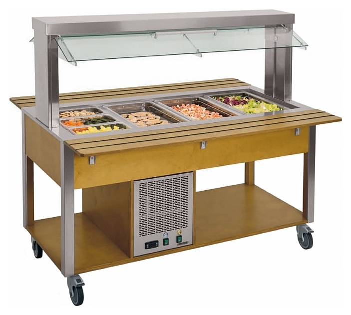 Шведский стол Metalcarrelli 6900.6M-R предназначен для кратковременного хранения и демонстрации продуктов и готовых блюд на предприятиях общественного питания, а также в розничных торговых точках. Устройство оснащено удобной в использовании панелью управления с цифровым термостатом, термометром и выключателем с сигнальной лампой. Верхняя часть стола снабжена ванной, выполненной из нержавеющей стали AISI 304, предназначенной для установки в нее нескольких гастроемкостей стандартного типа. Конструкция оснащена регулируемым по высоте козырьком из закаленного стекла, размещенным на 2 стальных опорах. Гастроемкости в комплект поставки не входят. Особенности: