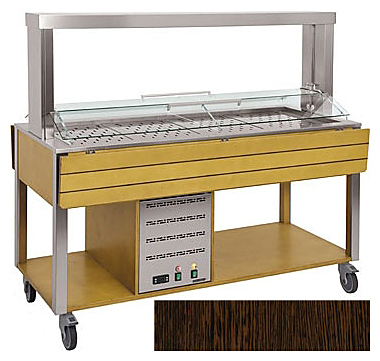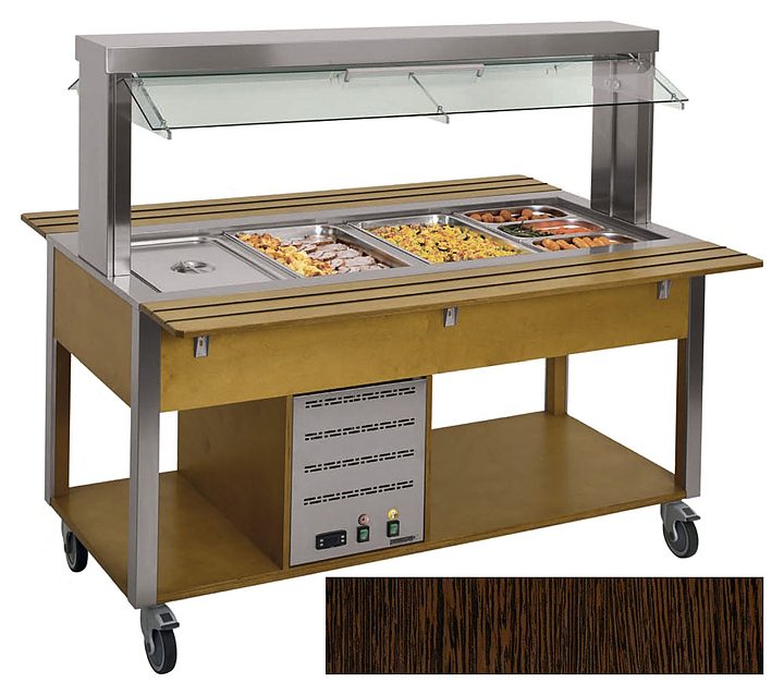 Шведский стол Metalcarrelli 6910.3M-W предназначен для демонстрации и кратковременного хранения продуктов и готовых блюд при температуре их подачи на предприятиях общественного питания, а также в розничных торговых точках. Устройство оснащено удобной в использовании панелью управления с цифровым термостатом, термометром и выключателем с сигнальной лампой. Верхняя часть стола снабжена ванной, выполненной из нержавеющей стали AISI 304, предназначенной для установки в нее нескольких гастроемкостей стандартного типа. Конструкция оснащена регулируемым по высоте козырьком из закаленного стекла, размещенным на 2 стальных опорах. Гастроемкости в комплект поставки не входят. Особенности: