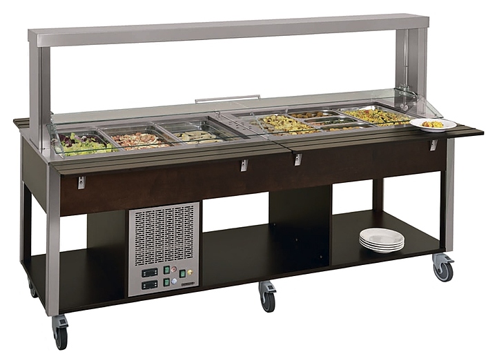 Шведский стол Metalcarrelli 6920.4F2M-W предназначен для демонстрации и кратковременного хранения продуктов и готовых блюд на предприятиях общественного питания, а также в розничных торговых точках. Устройство оснащено удобной в использовании панелью управления с цифровым термостатом, термометром и выключателем с сигнальной лампой. Верхняя часть стола снабжена ванной, выполненной из нержавеющей стали AISI 304, предназначенной для установки в нее нескольких гастроемкостей стандартного типа. Ванна делится на 2 отсека, в одном из которых осуществляется охлаждение помещенных в него продуктов, в другом - подогрев. Конструкция оснащена регулируемым по высоте козырьком из закаленного стекла, размещенным на 2 стальных опорах. Гастроемкости в комплект поставки не входят. Особенности: