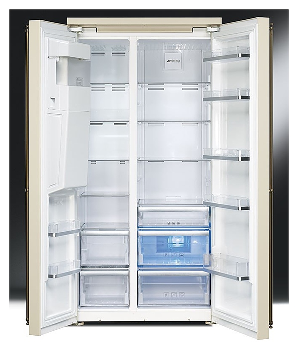 Холодильник Smeg SBS8004PO предназначен для заморозки и долговременного хранения продуктов и готовых блюд. Touch LCD дисплей устройства позволяет легко осуществлять управление внутренней температурой, а также активировать режим быстрой заморозки, режим отпуска, режим Eco, а также заблокировать управление от детей и установить акустический сигнал при повышении температуры. Холодильное отделение прибора снабжено 4 стеклянными полками, 1 из которых является фиксированной, и 3 стеклянными ящиками для хранения овощей. Морозильное отделение холодильника оснащено 4 стеклянными полками и 2 ящиками. Особенности: