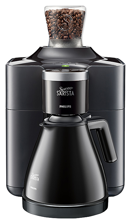Кофемашина Philips Senseo Sarista используется на предприятиях общественного питания и торговли для варки зернового кофе. Модель оснащена световой сигнализацией о окончании воды, кофе, заполнении бункера отходов и необходимости провести декальцинацию. В комплект поставки входят чайник-термос и 2 съемных герметичных бункера для зернового кофе. Особенности: