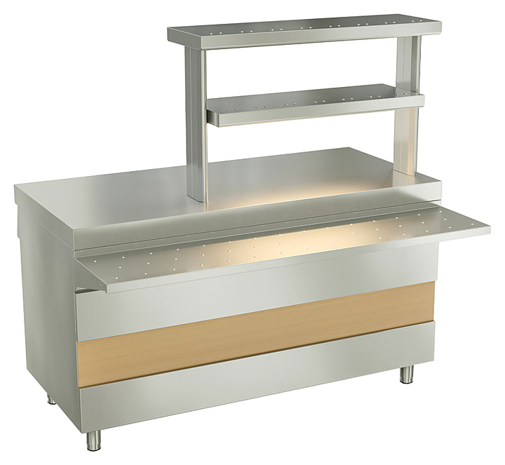 Прилавок ATESY Ривьера предназначен для демонстрации товаров, не требующих дополнительных условий хранения, таких как чай, кофе, готовые кондитерские изделия, а также чайные принадлежности. Модель оснащена стойкой с двумя полками, занимающими не всю длину стола, таким образом, рядом с ними можно разместить большой кипятильник или готовые напитки. Особенности: