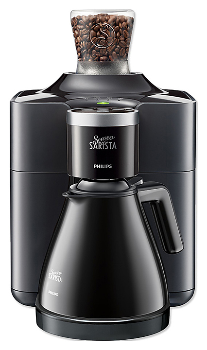 Автоматическая кофемашина Saeco Senseo Sarista используется в офисах, на предприятиях общественного питания и торговли для приготовления 1 и 2 чашек кофе из зерен. Модель оснащена световой сигнализацией, предупреждающей об окончании воды, кофе, заполнении бункера отходов и необходимости провести декальцинацию. В комплект поставки входит чайник-термос. Особенности: