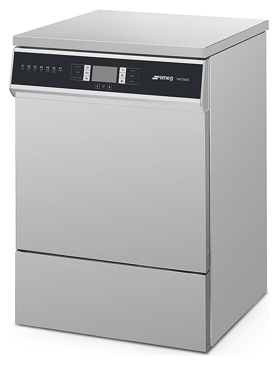 Посудомоечная машина с фронтальной загрузкой Smeg SWT260X используется на предприятиях пищевой промышленности, общественного питания и торговли для мойки тарелок, стаканов, чашек и др. посуды. Оборудование оснащено электронным управлением, цельнотянутым моечным баком с закругленными углами и сбалансированной дверцей с двойной теплоизоляцией. Корпус имеет двойные стенки. Корпус, моющие и ополаскивающие рукава выполнены из нержавеющей стали AISI 304. Особенности: