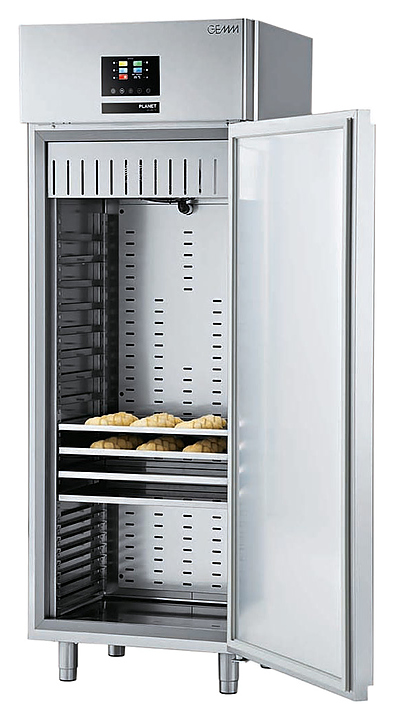 Шкаф отложенной расстойки Gemm AFLV/20B серии PLANET предназначен для расстойки тестовых заготовок перед процессом выпечки в пекарском шкафу или промышленной духовке на предприятиях общественного питания и торговли. Процесс можно разбить на две фазы: «холодную», когда продукт сохраняется до 6 дней при холодной температуре без расстойки, и «горячую», при которой обеспечивается сама расстойка. Модель оснащена цифровым термостатом. В комплект поставки входят 20 пар направляющих для решеток под размер 600х400 мм. Особенности: