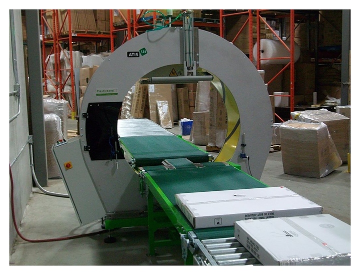 Упаковочная машина Plasticband Atis 125 предназначена для упаковки, группировки и защиты длинномерных изделий, таких как молдинги, профили, элементы мебели, алюминиевые трубы и жалюзи в стрейч-пленку на предприятиях различных направлений. Модель оснащена сенсорным дисплеем и фотодатчиком для активации цикла упаковки. Особенности: