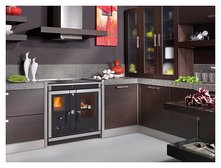 Дровяная печь-камин La Nordica Italy Termo Built-in D.S.A. серии TermoCucine a Legna предназначена для создания тепла в помещении в квартирах, частных домах и отелях. Модель оснащена системой повторного дожига, позволяющей сократить выбросы, системой чистого стекла, предотвращающей образование отложений, устройством безопасности D.S.A., снижающим быстро температуру воды, духовкой со стеклом и дровником. Духовка выполнена из эмали, плита и кольца - из полированного чугуна, рамка - из остеклованного чугуна. Оборудование облицовано эмалированным чугуном. Дополнительные характеристики: