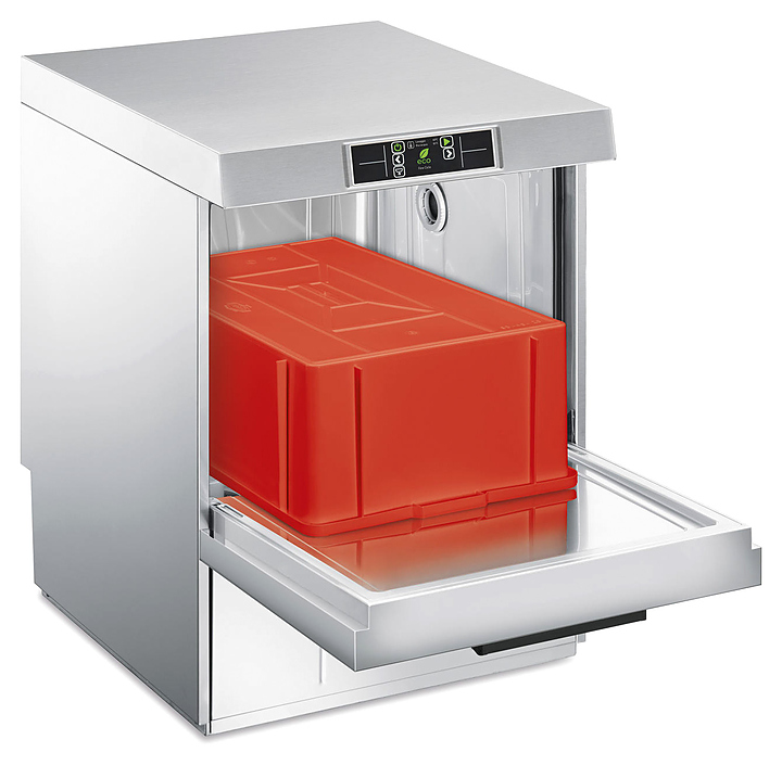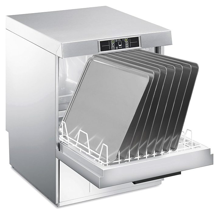 Посудомоечная машина с фронтальной загрузкой Smeg UD526D серии Topline используется на предприятиях общественного питания и торговли для мойки столовых приборов, тарелок, стаканов, чашек и другой посуды. Модель оснащена электронной панелью управления. Корпус выполнен из нержавеющей стали AISI 304. Комплектация: