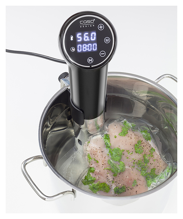Аппарат Sous Vide CASO SV 200 используется в частных домах и квартирах для приготовления пищи в герметичных пакетах в горячей воде при невысоких температурах, что позволяет сохранить в продуктах все питательные вещества, витамины и минералы и обеспечить насыщенный вкус мяса и овощей. Модель оснащена сенсорной панелью управления с дисплеем. Корпус выполнен из нержавеющей стали. Особенности: