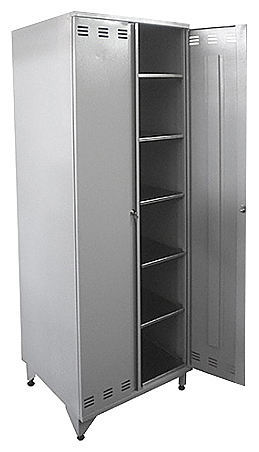 Кухонный шкаф Пищевые Технологии ШКХ-Р-О предназначен для размещения хлебаи продуктов на предприятиях общественного питания и торговли. Модель оснащена 2 секциями по 5 полок в каждой, 2 распашными дверцами с замками и регулируемыми по высоте ножками. Корпус выполнен из стали, окрашенной порошковой краской, полки - из нержавеющей стали. Дополнительные характеристики: