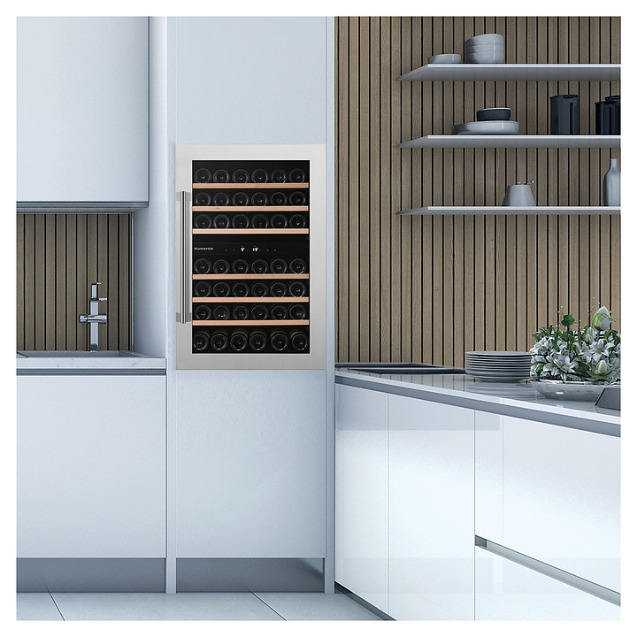 Винный шкаф Dunavox DAB-42.117DB серии Built-in предназначен для демонстрации, хранения и создания оптимальных условий для сохранения всех вкусовых свойств вина в бутылках на предприятиях общественного питания, торговли, в барах, ресторанах, специализированных магазинах, частных домах или квартирах. Модель оснащена сенсорной панелью управления и LED-подсветкой синего цвета в каждой зоне. Корпус выполнен из окрашенного металла, дверь - из рамы черного цвета и тонированного стекла с защитой от ультрафиолетовых лучей, выдвижные полки - из нелакированного бука, накладная ручка двери - из нержавеющей стали. Особенности: