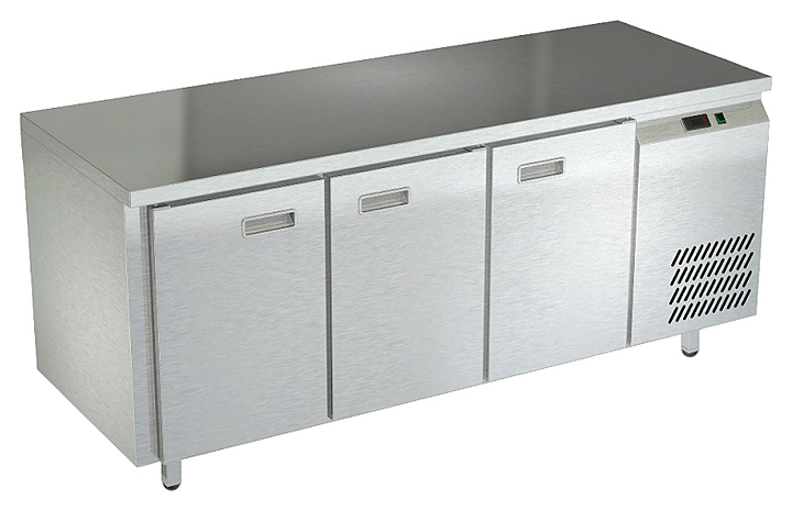 Холодильный стол Техно-ТТ СПБ/О-121/30-1806 предназначен для раскатки теста, обработки, охлаждения и кратковременного хранения продуктов и напитков на предприятиях общественного питания и торговли. Модель оснащена 3 секциями с 3 дверьми, петлями-доводчиками (Польша), регулируемой по высоте полкой-решеткой и круглыми ножками, регулируемыми по высоте на 50 мм (Италия). Корпус выполнен из нержавеющей стали AISI 430, задняя стенка и дно - из оцинкованной стали. Стол поставляется в собранном виде. Особенности: