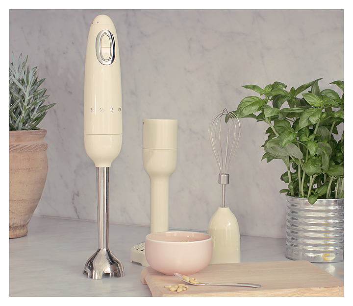 Блендер Smeg HBF02CREU предназначен для взбивания жидкого теста, кремов и коктейлей, измельчения фруктов, овощей, орехов и трав и приготовления супов-пюре в частных домах и квартирах. Модель выполнена в стиле 50-х годов. Устройство оснащено селектором скорости и эргономичной нескользящей ручкой. Ручка выполнена из окрашенного пластика, погружная часть и ножи- из нержавеющей стали. Комплектация: